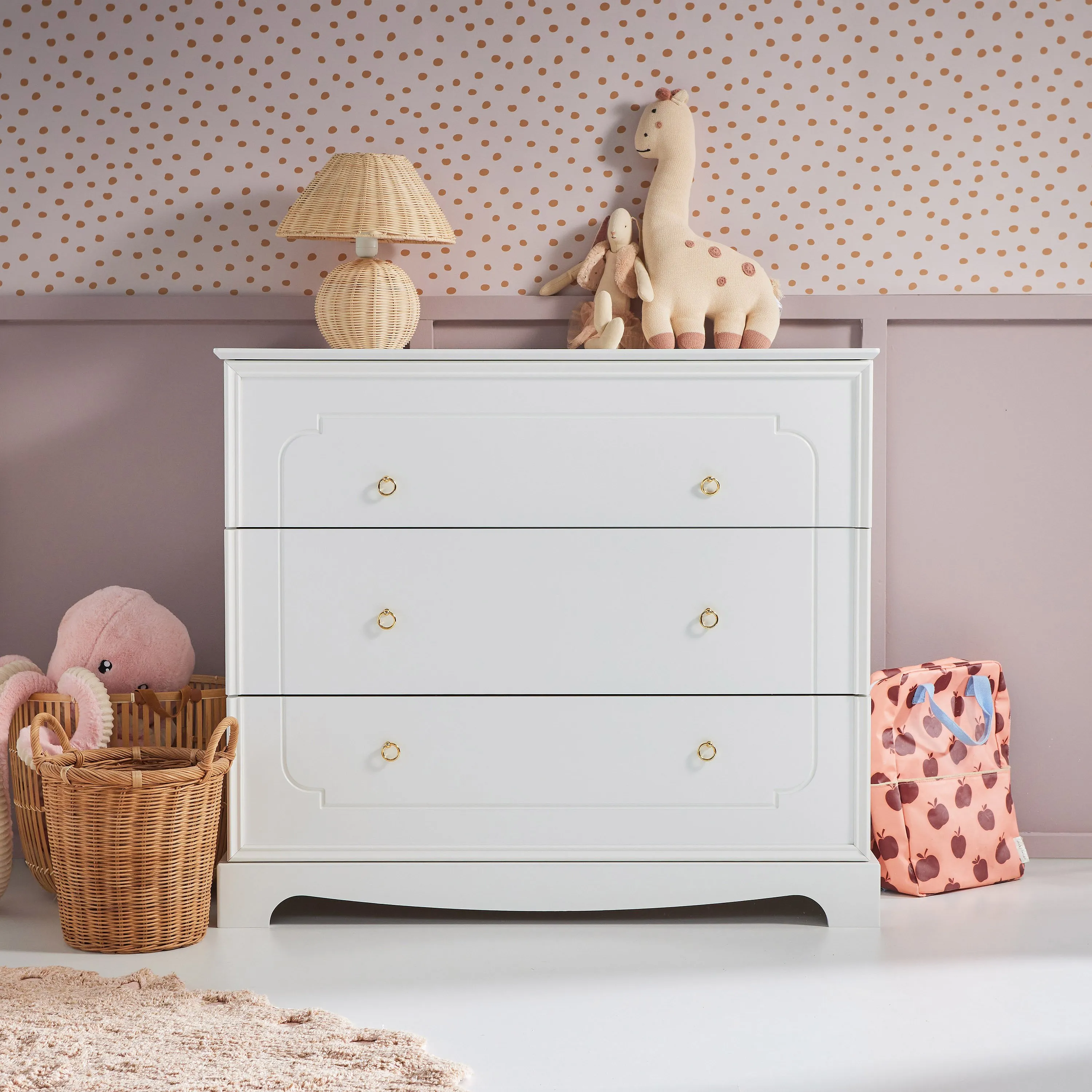 Erdvūs trys stalčiai. Galimas vystymo stalo pasirinkimas. Vystymo stalo matmenys : ilgis 75,8cm / plotis 59,6cm / aukštis 8cm.