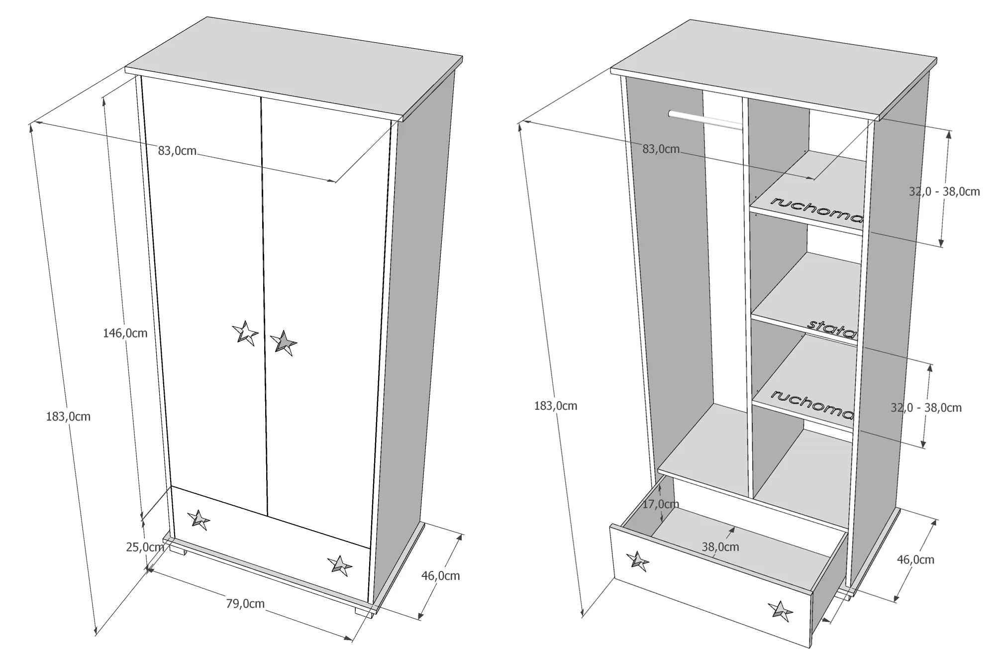 Ilgis: 83cm / Plotis: 46cm / Aukštis: 183cm