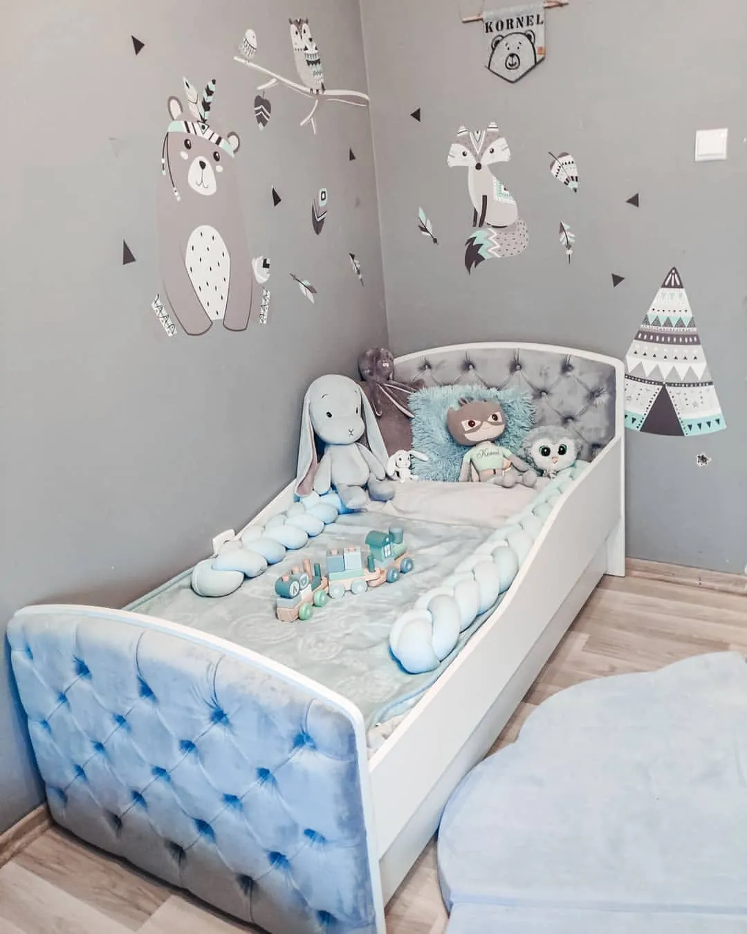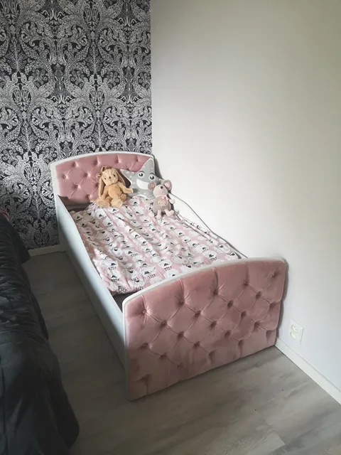 Medžiaga: lova pagaminta iš labai aukštos kokybės medienos drožlių plokštės. Lova padengta zomšu, apsaugo vaiką nuo susimušimų