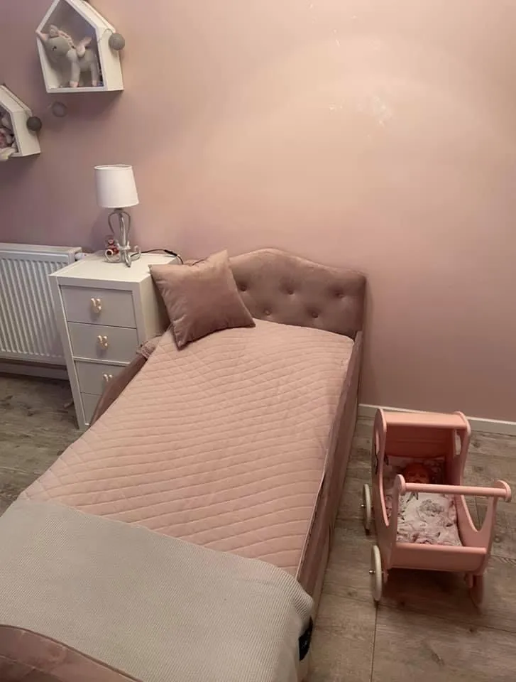 Lova aptraukta iš visų pusių aukštos kokybės veliūru, kuris puikiai valosi. Minkšta medžiaga apsaugo vaiką nuo susimušimų
